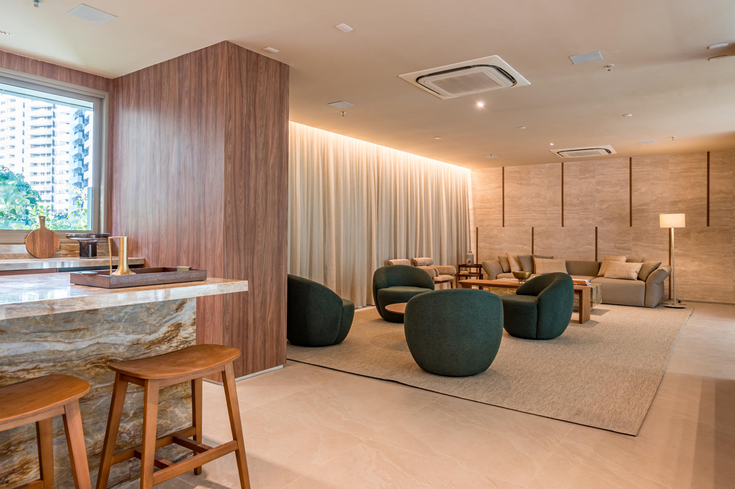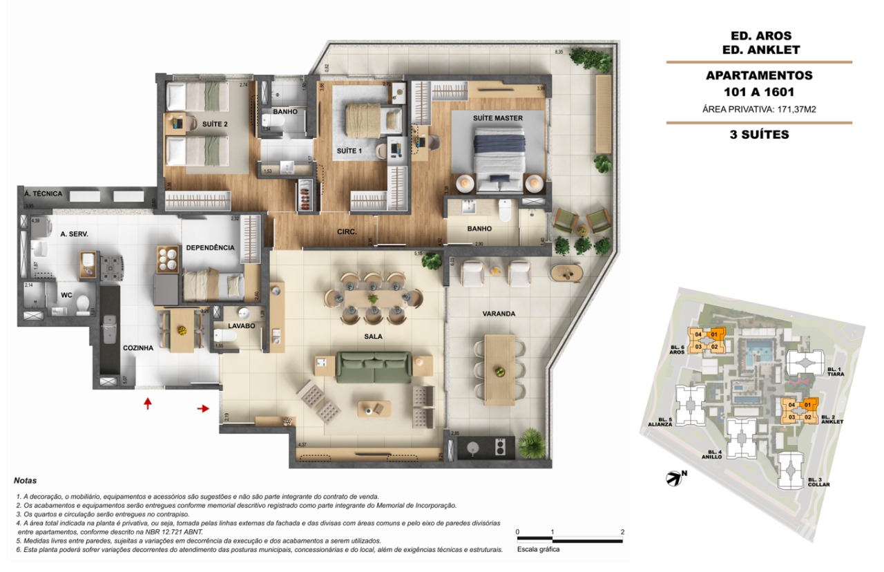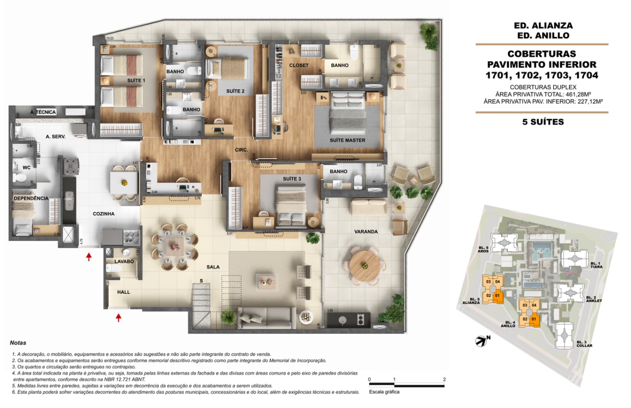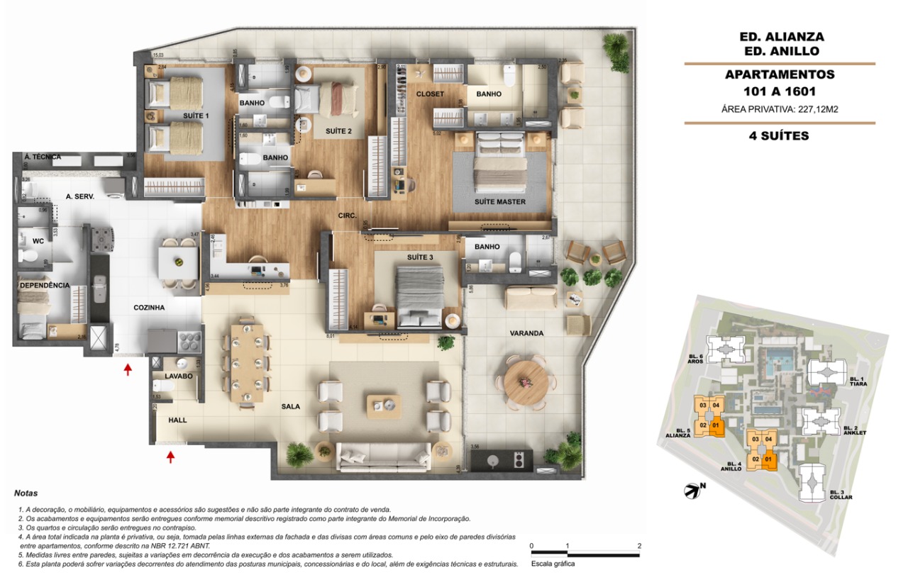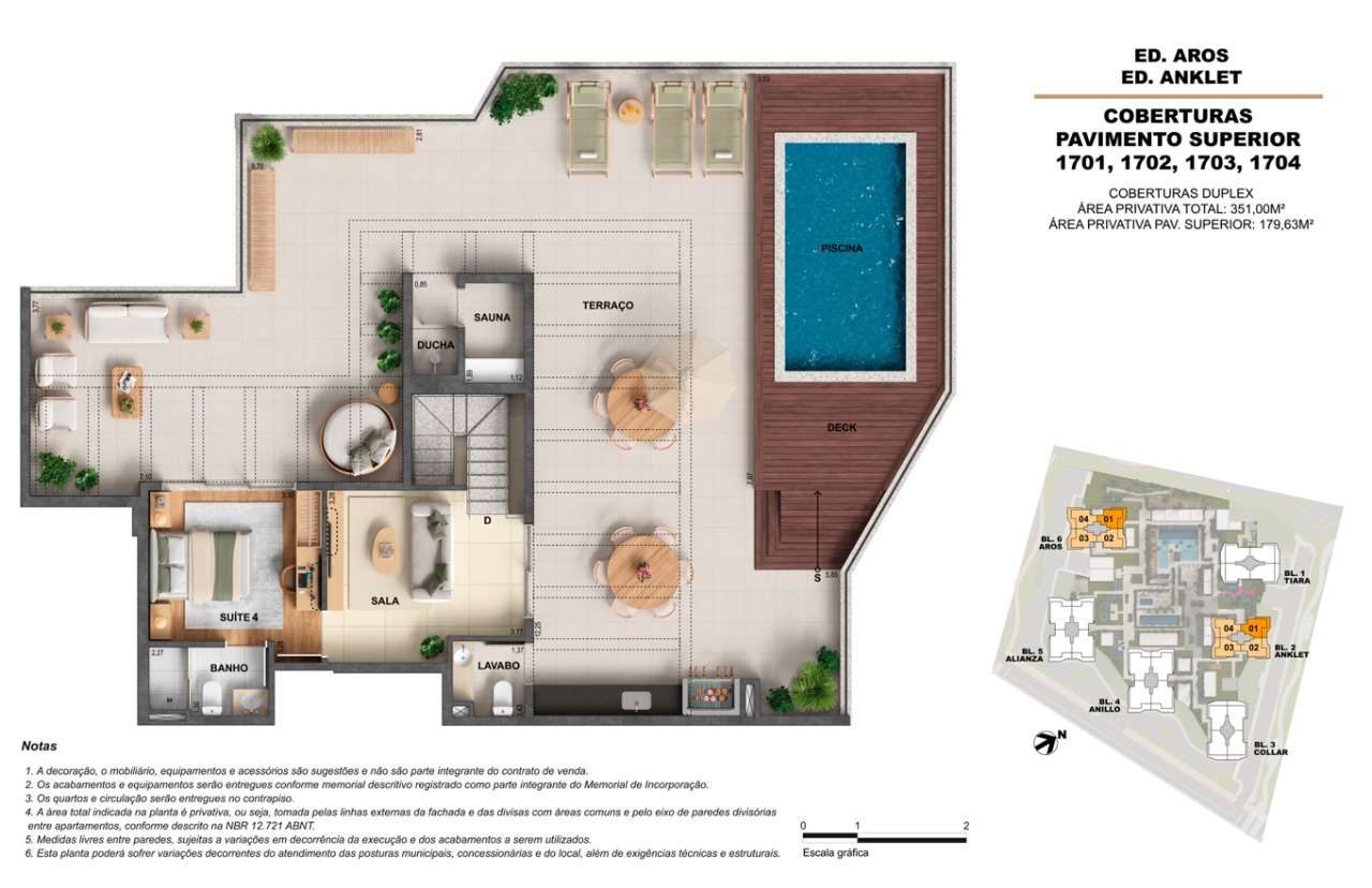Áreas de lazer: Piscinas com raia, deck sunset, spa, salões de festas, espaços gourmet e coworking, todos projetados para oferecer bem-estar e convivência.