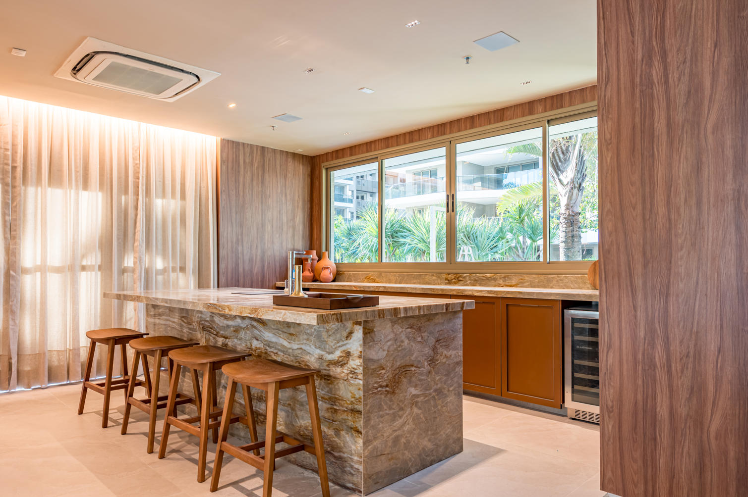Fachada: Arquitetura imponente, marcada por revestimentos nobres e grandes aberturas de vidro, destacando a vista para lagoa, montanhas e mar.