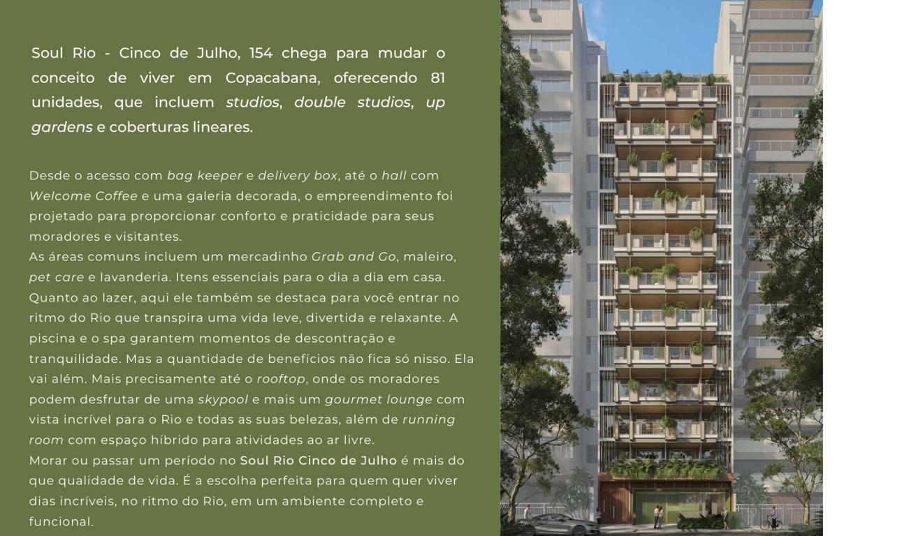 | Critério | Soul Rio – Cinco de Julho | Outros Empreendimentos em Copacabana |